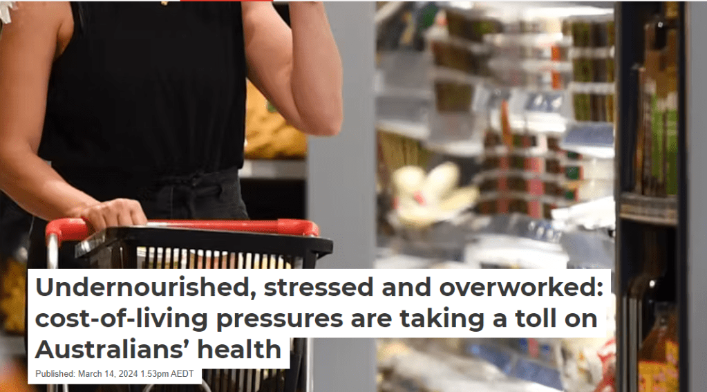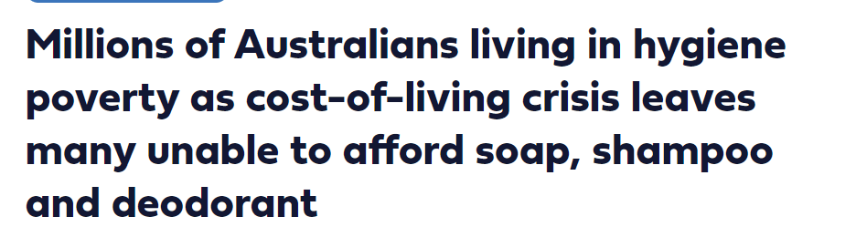 Headlines from mainstream media below are quite confronting. We’re no longer the “lucky country” – we’re a place where middle class, two income families sleep in cars and cant afford toiletries.