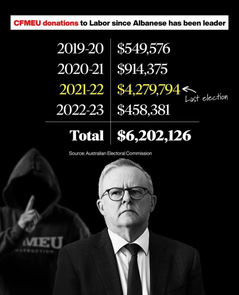 | Dear Friend, Startling revelations that the CFMEU has been infiltrated by organised crime and underworld figures should concern all Australians. Also concerning is that since Anthony Albanese has been Labor Leader, the ALP has received $6.2 million in payments from the CFMEU. Australia’s construction industry is vital for the delivery of infrastructure, including roads, schools, hospitals. It employs over a million Australians. It is made up of hundreds of thousands of small businesses. Without a strong watchdog, this industry is held hostage by the CFMEU – described by a Federal Court Judge as “the most recidivist corporate offender in Australia’s history”. Unfortunately, the Albanese Government puts the CFMEU’s interests ahead of everyday Australians. One of Labor’s first acts in Government was to remove the building industry watchdog, the Australian Building and Construction Commission. This has been a disaster. Between 2016 and 2023, the CFMEU were fined by courts for over 1,600 law breaches. Despite this, Labor prioritised giving them more power. Labor’s weak leadership means higher costs in building vital infrastructure. It adds to further cost of living pressure for all Australians. This needs to change. When Bob Hawke was Prime Minister, he deregistered the Builders Labourers Federation. Recent media reports show the CFMEU has no right to still be operating. The Albanese Government should deregister this out-of-control union. It should reintroduce the building industry watchdog. It should also return the money donated by the CFMEU in recent years. Enough is enough. |
